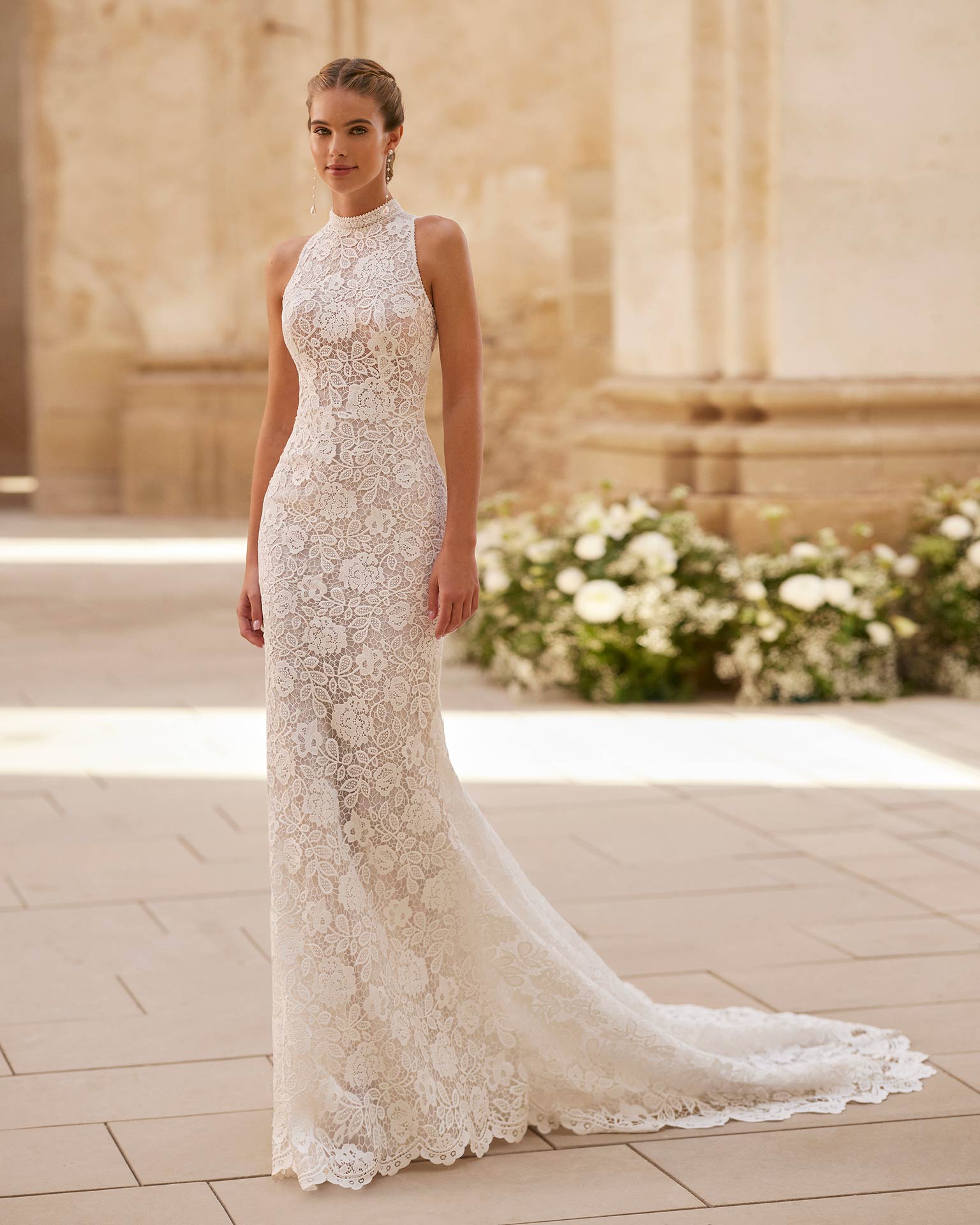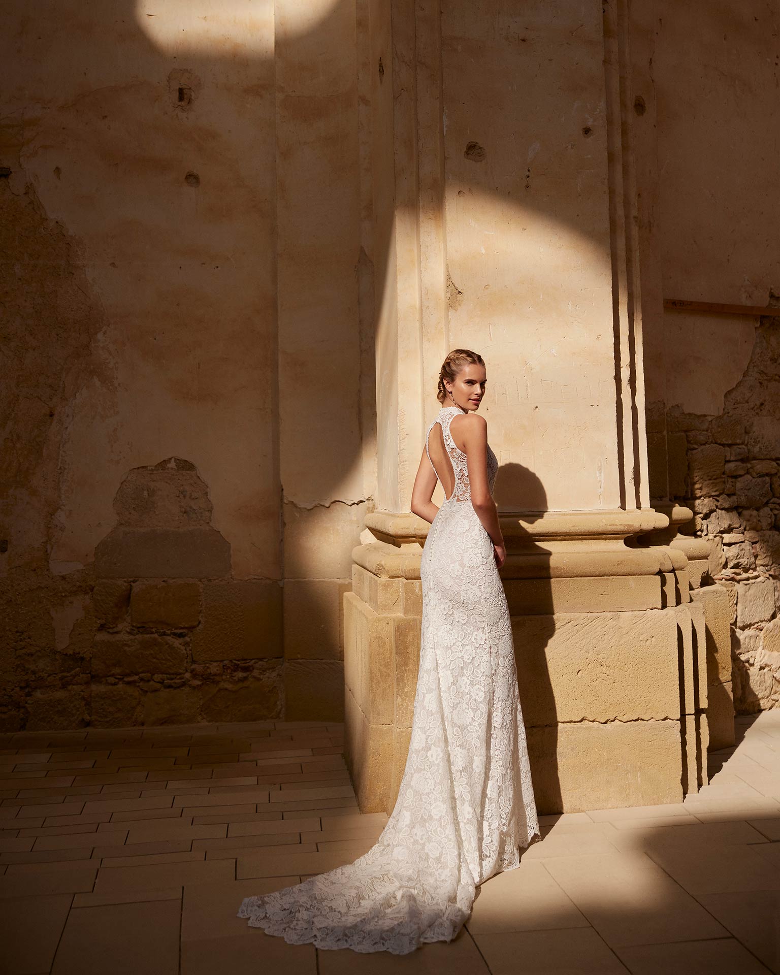 Ibiza-inspired long mermaid gown in guipure lace, featuring a halter neckline and an elegant teardrop back.