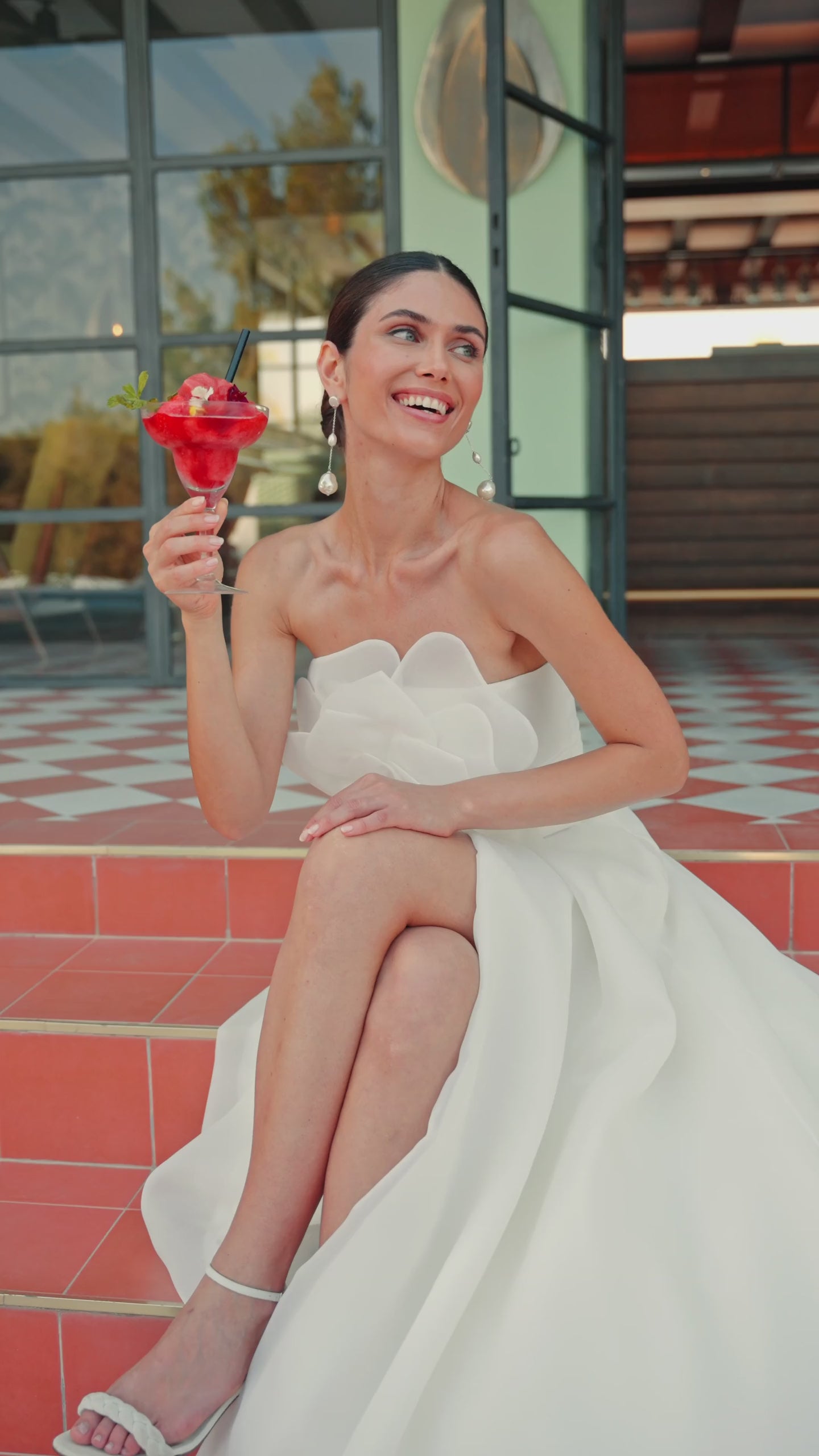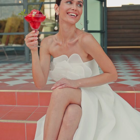 Long garza ballgown wedding dress with a strapless neckline, a low back, and a skirt highlighted by a graceful side slit.