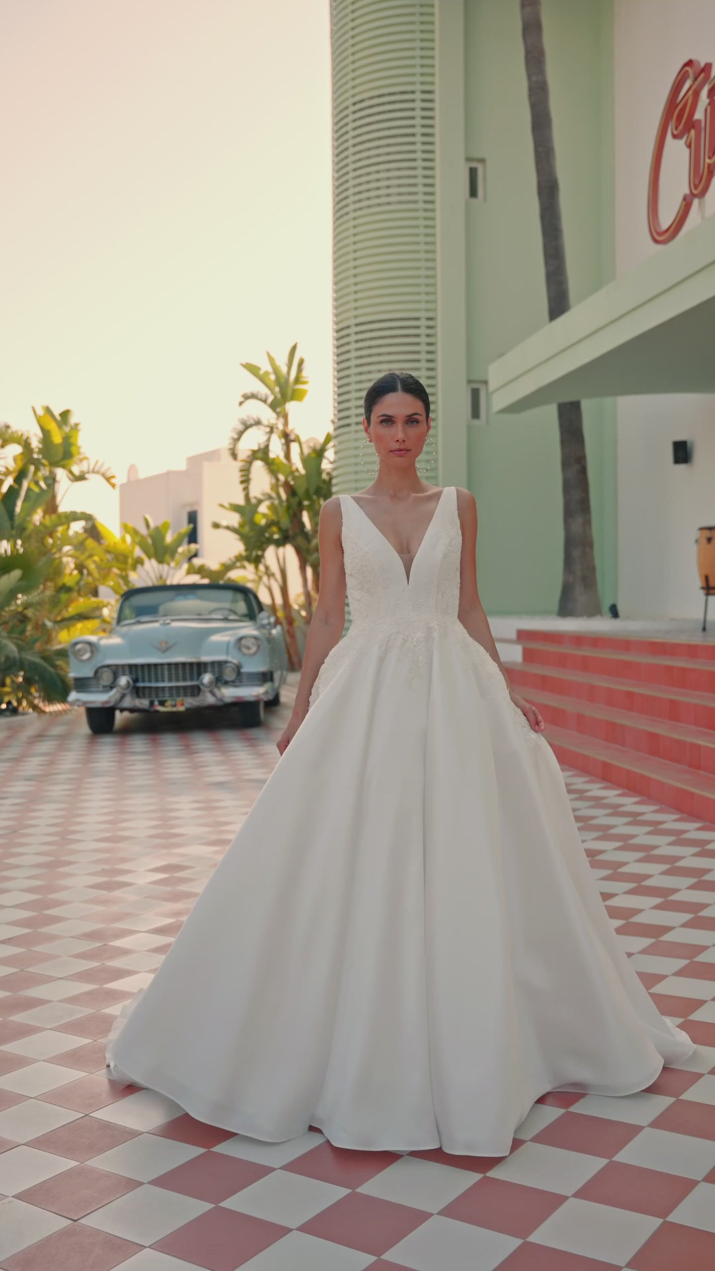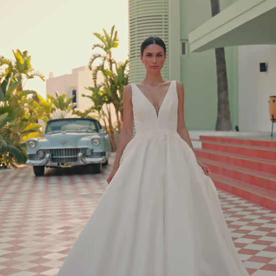 Long mikado ballgown wedding dress, featuring a flattering V-neckline, classic straps, and an illusion back for a soft romantic touch.