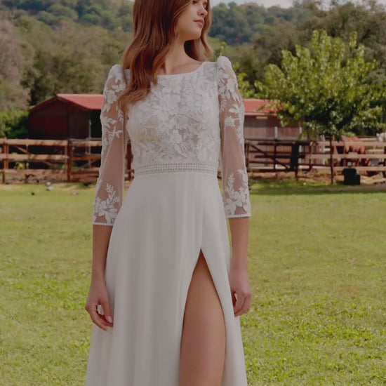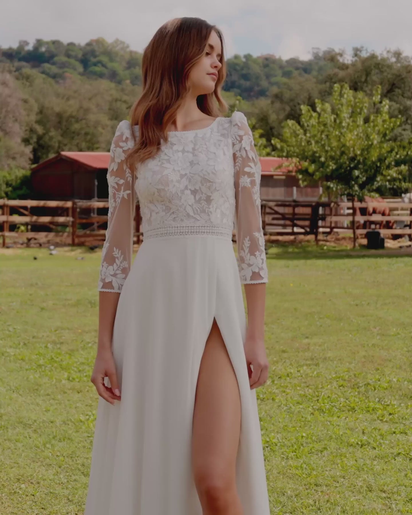 Long straight-cut georgette gown with a slit skirt, round neckline, three-quarter sleeves, and an open back.