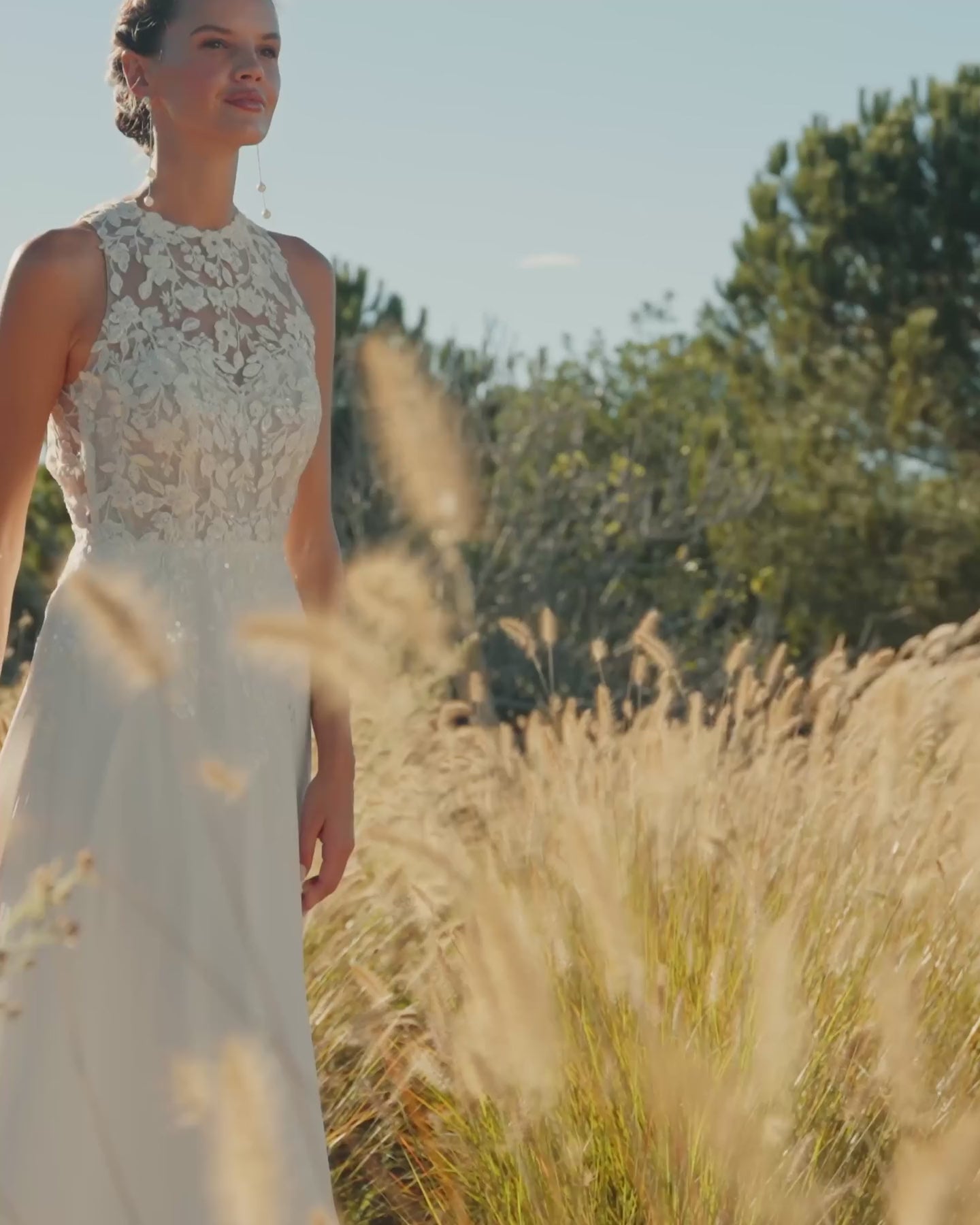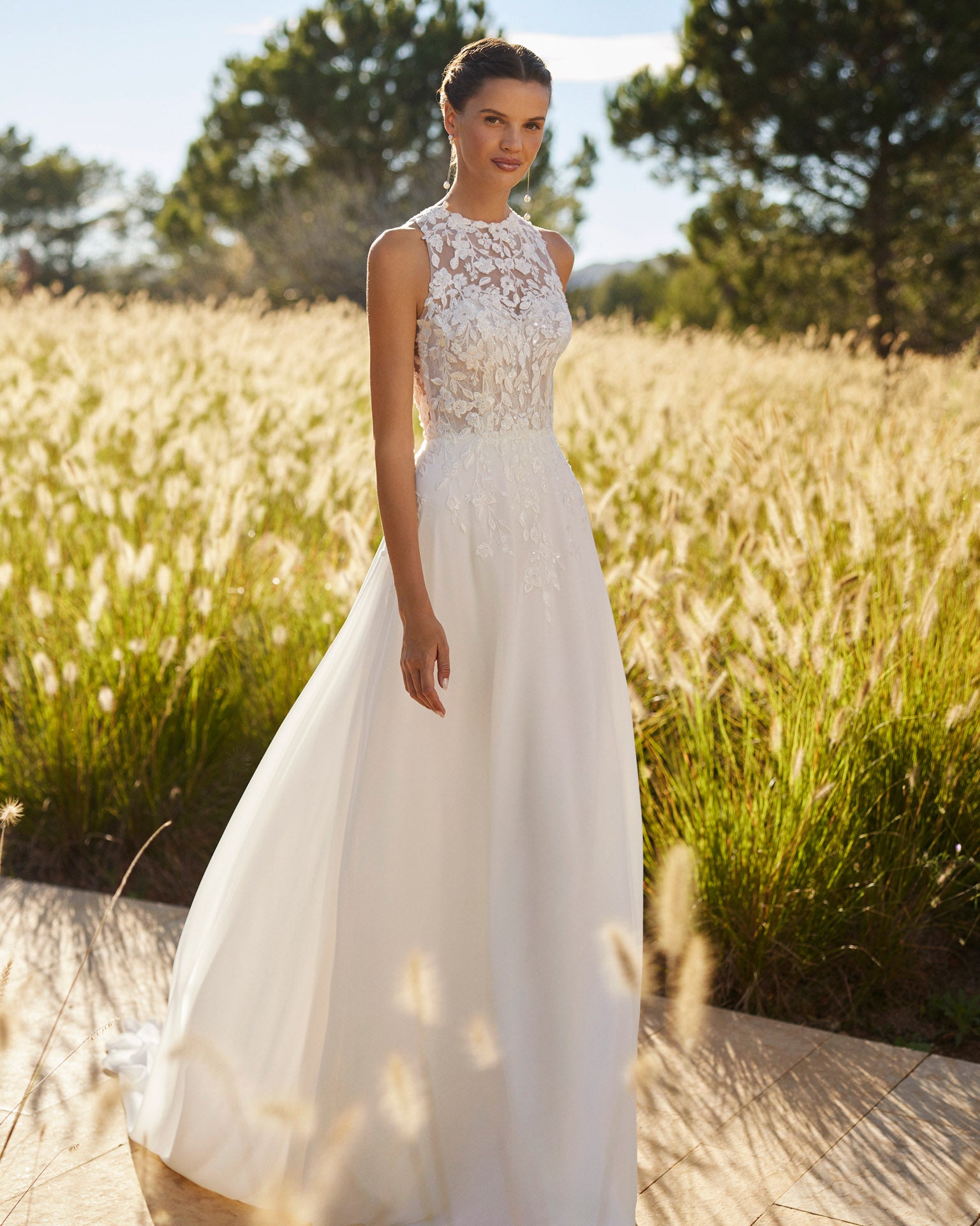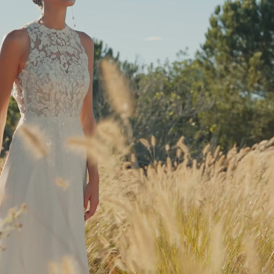 Long straight georgette gown with a lace-and-beaded bodice, halter neckline, and a beautifully open back.