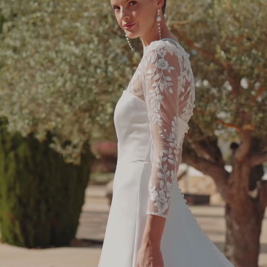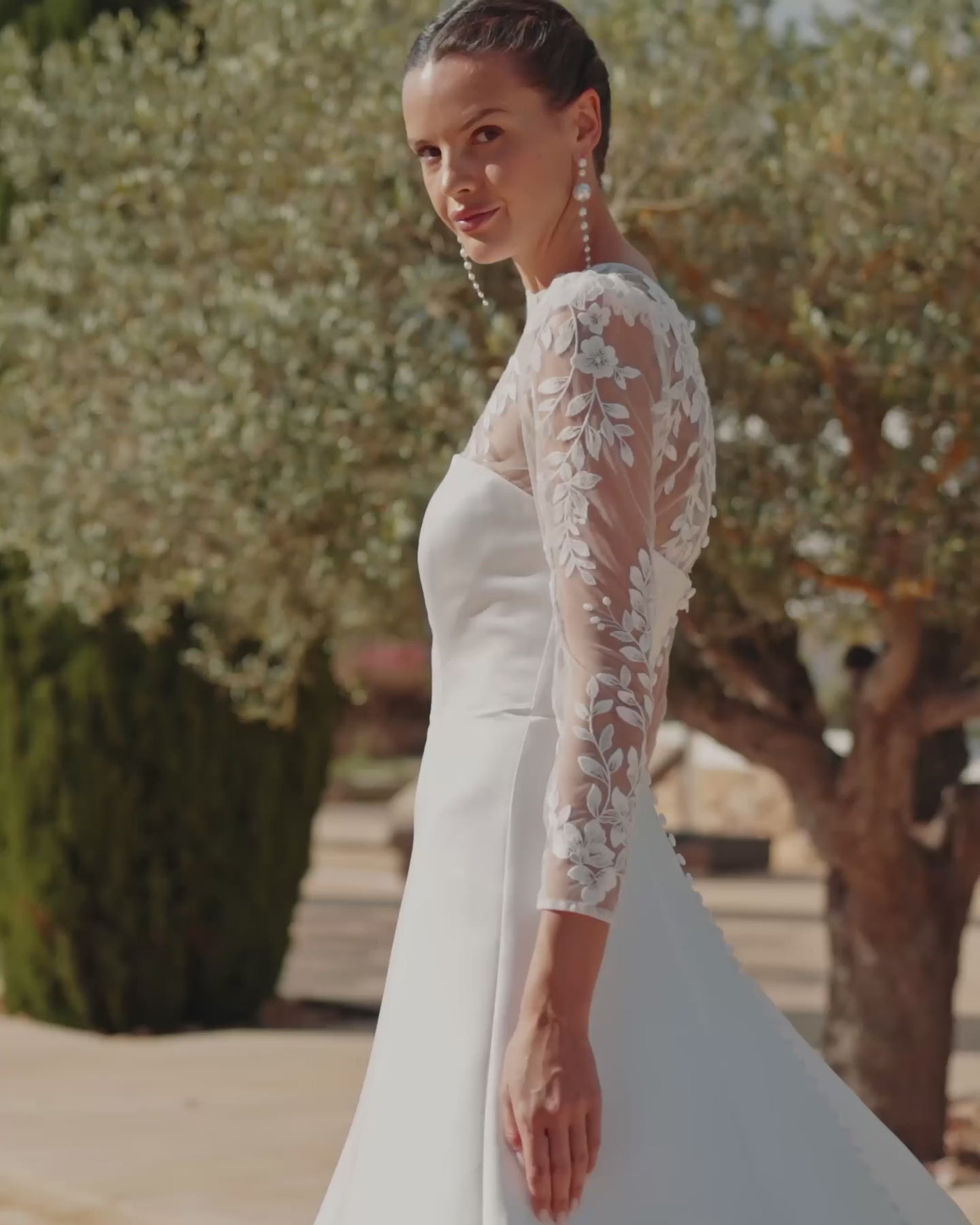 Long two-piece A-line satin gown with a timeless strapless neckline and a matching coat for an elegant finish.
