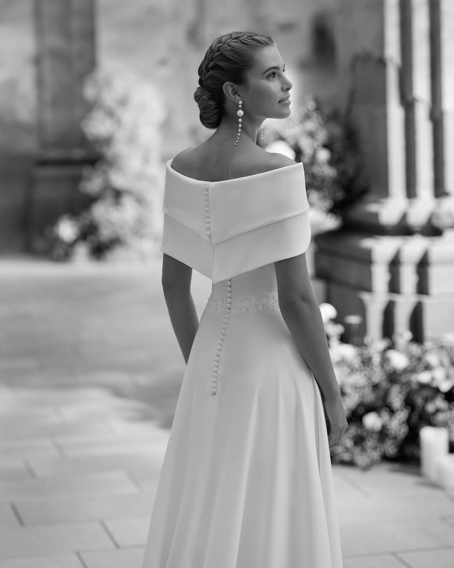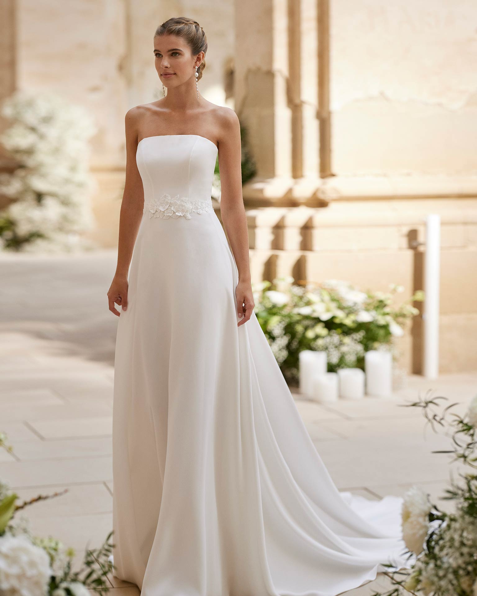 Two-piece A-line princess gown in stretch crêpe, pairing a strapless silhouette with a detachable crêpe cuff neckline.