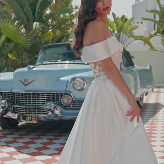 Long two-piece ballgown wedding dress in mikado, featuring a graceful strapless neckline, an elegant cut-out open back, and a flowing overskirt.