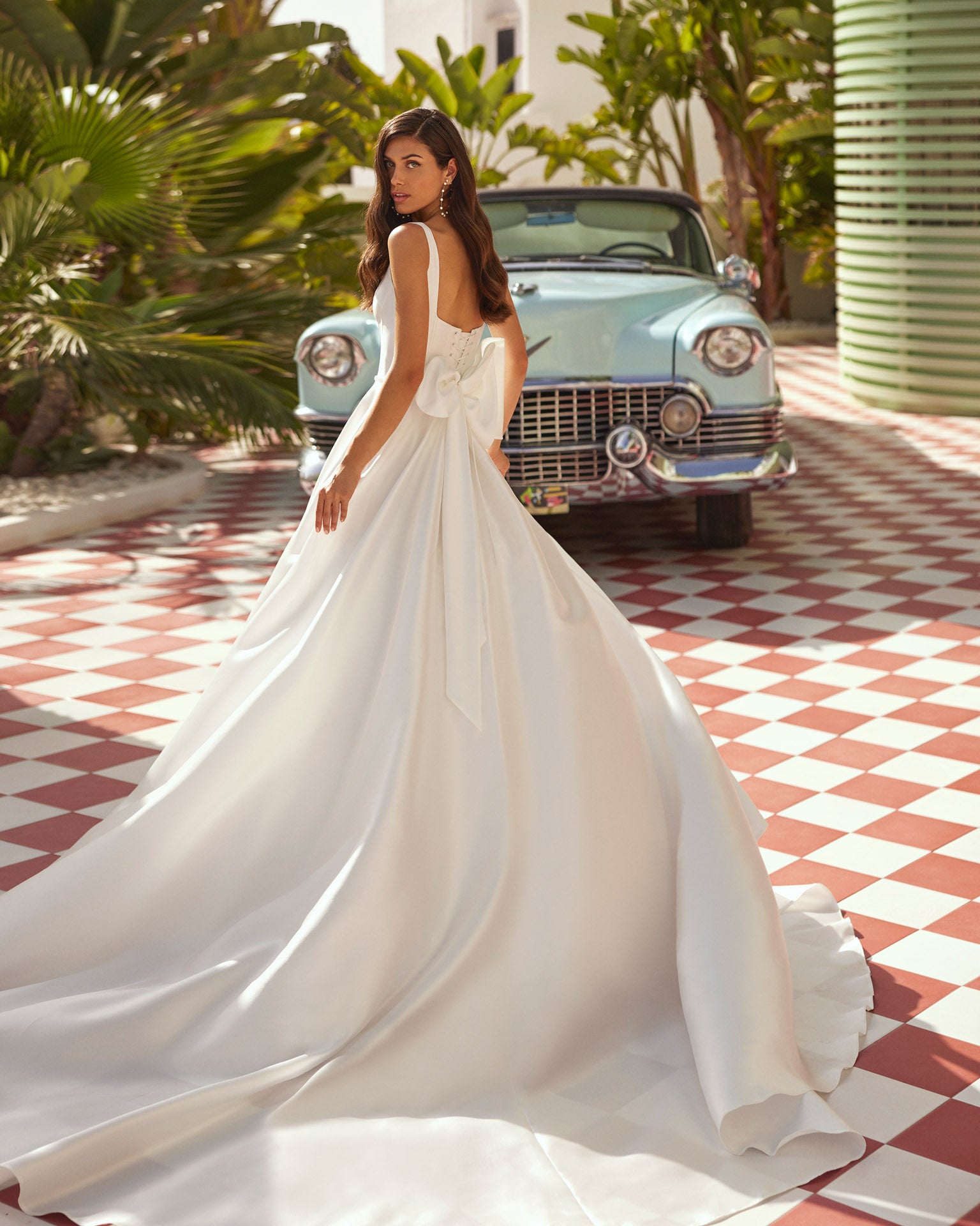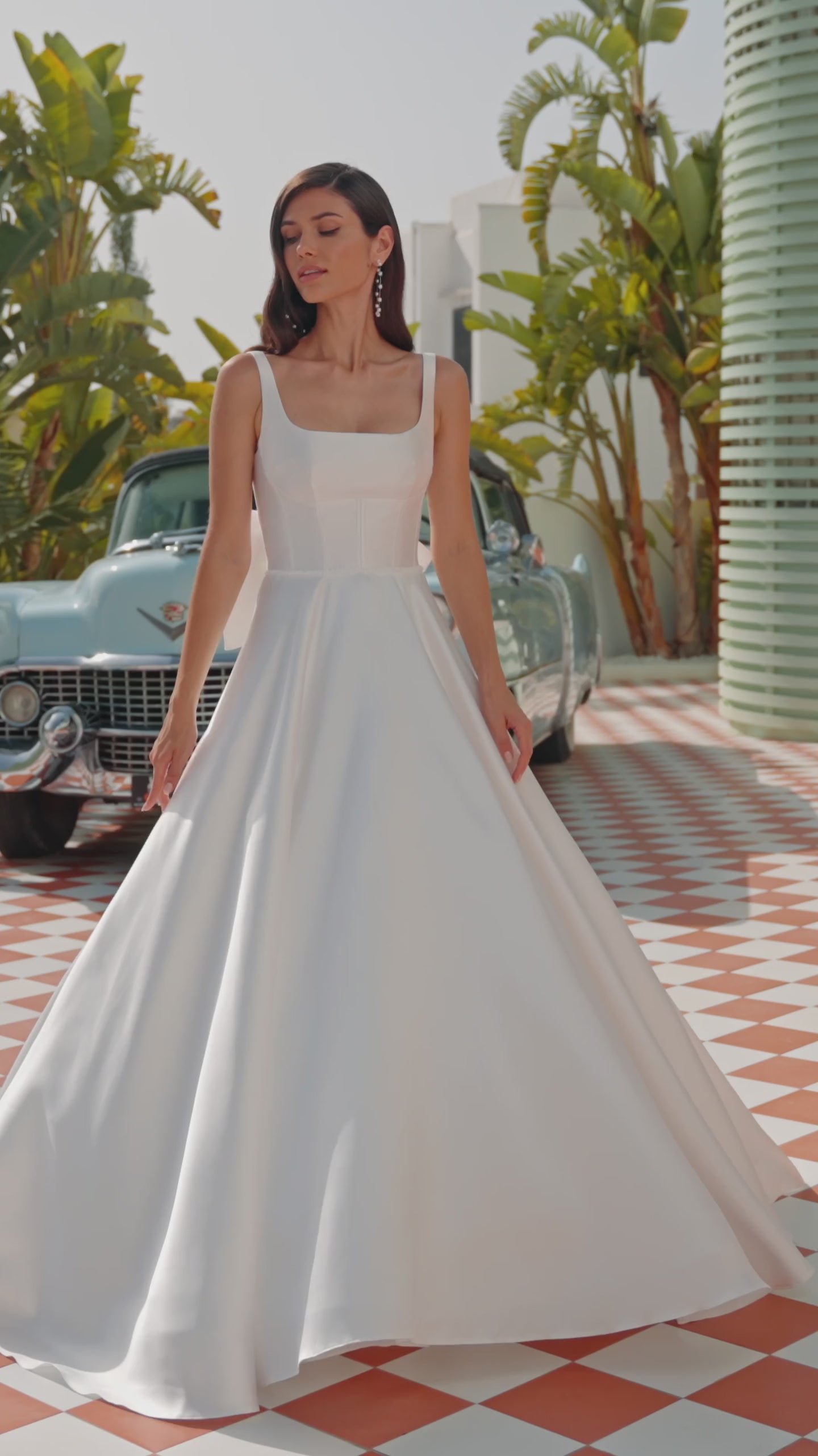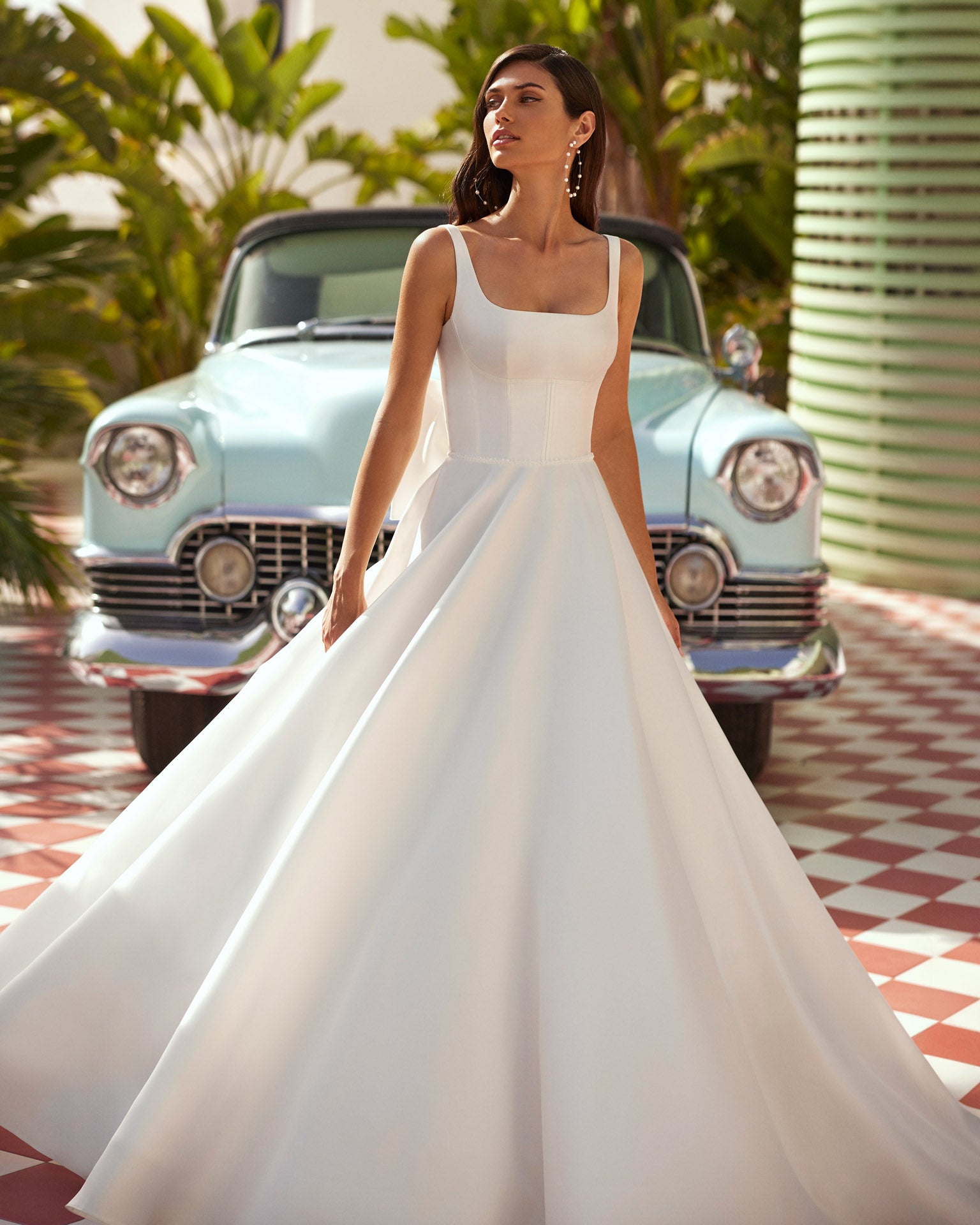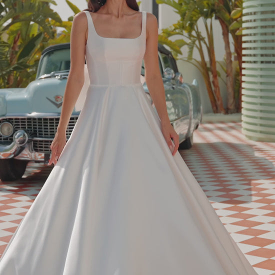 Long mikado ballgown wedding dress, featuring a square neckline, classic straps, a corset back, and a romantic bow.