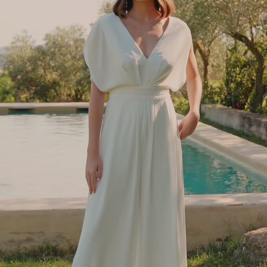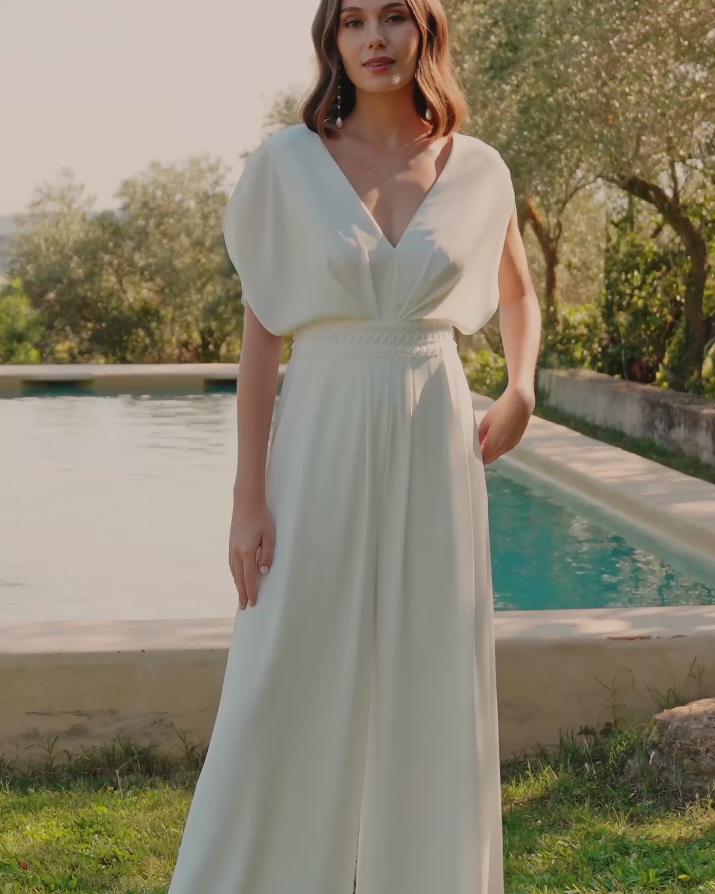 Long straight-cut bridal jumpsuit in crepe with a V-neckline, fluttery butterfly sleeves, and an open back.