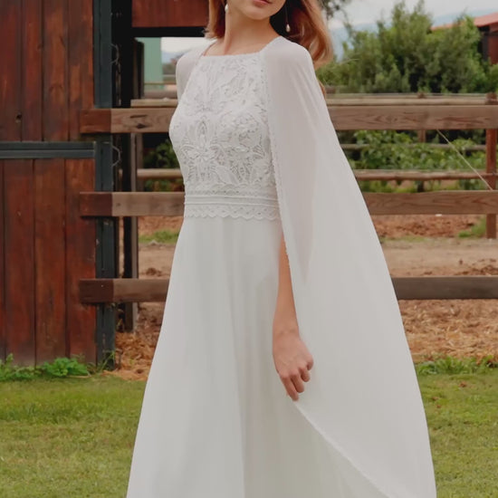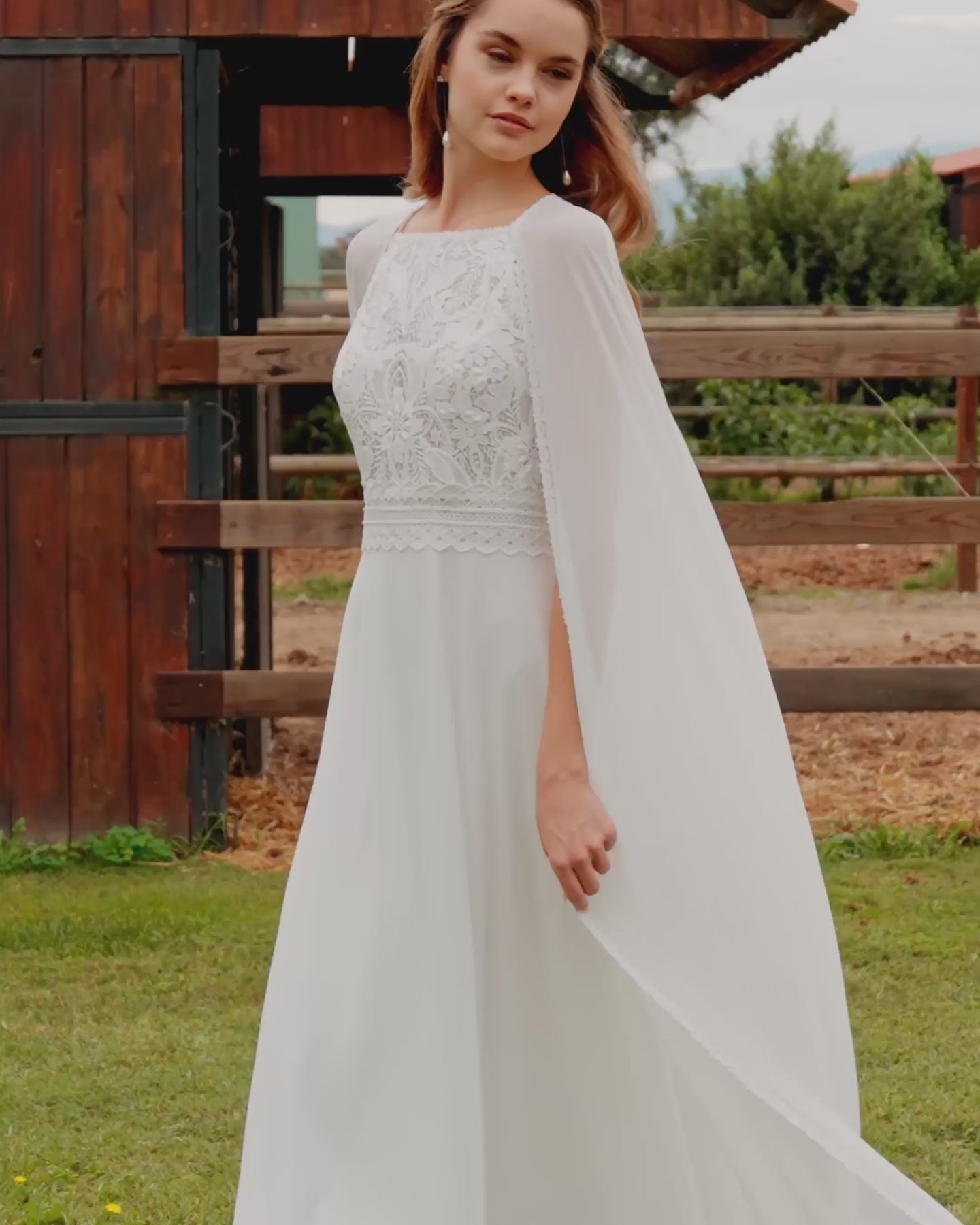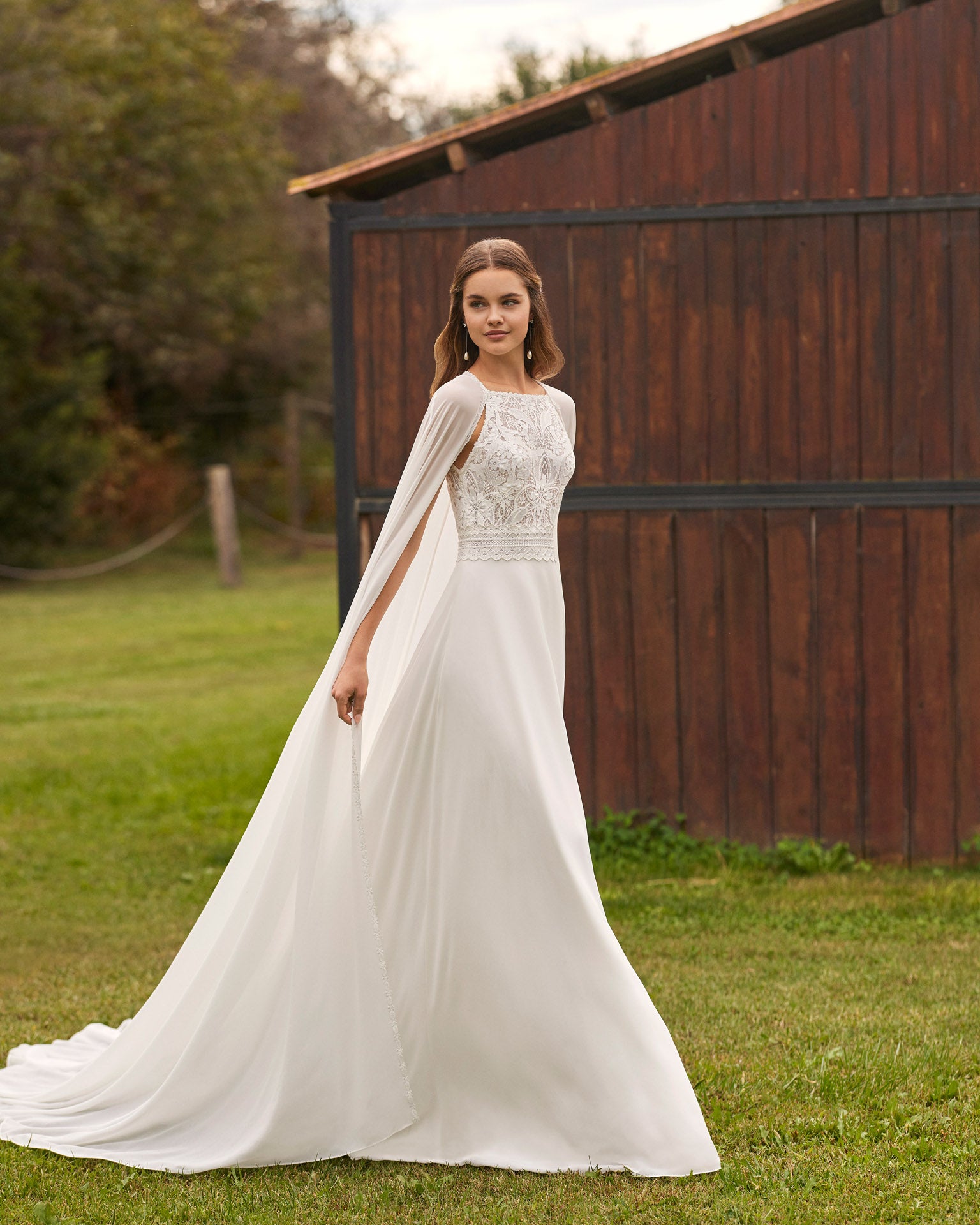 Long two-piece straight-cut bridal gown in georgette and guipure, featuring a straight neckline, straps, and an open back completed with a cape.
