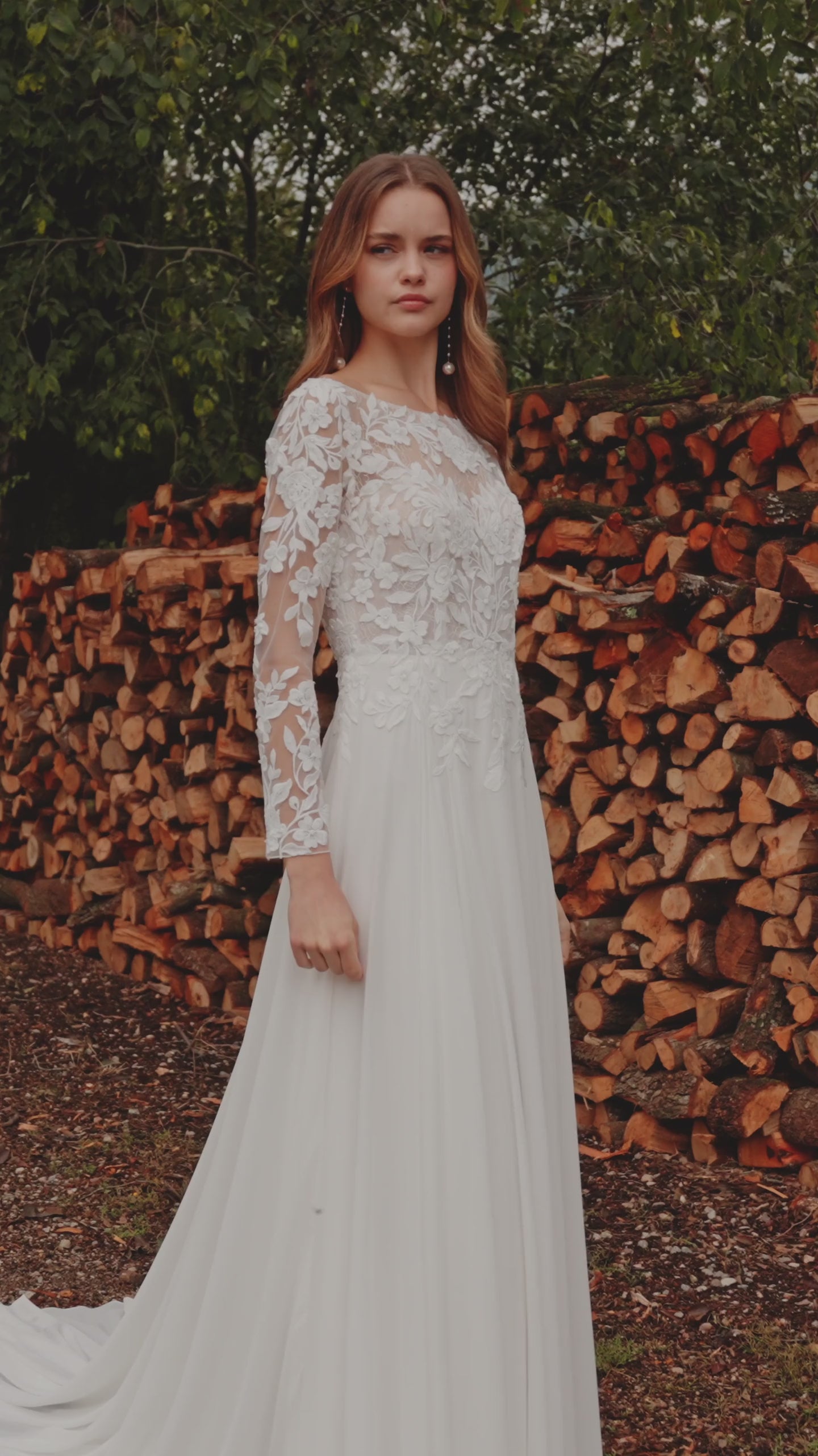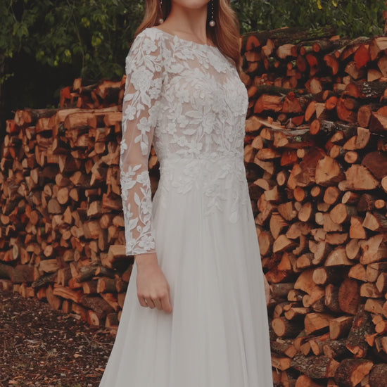 Long straight-cut bridal gown in georgette and lace, featuring a bateau neckline, lace sleeves, and an elegant open back.