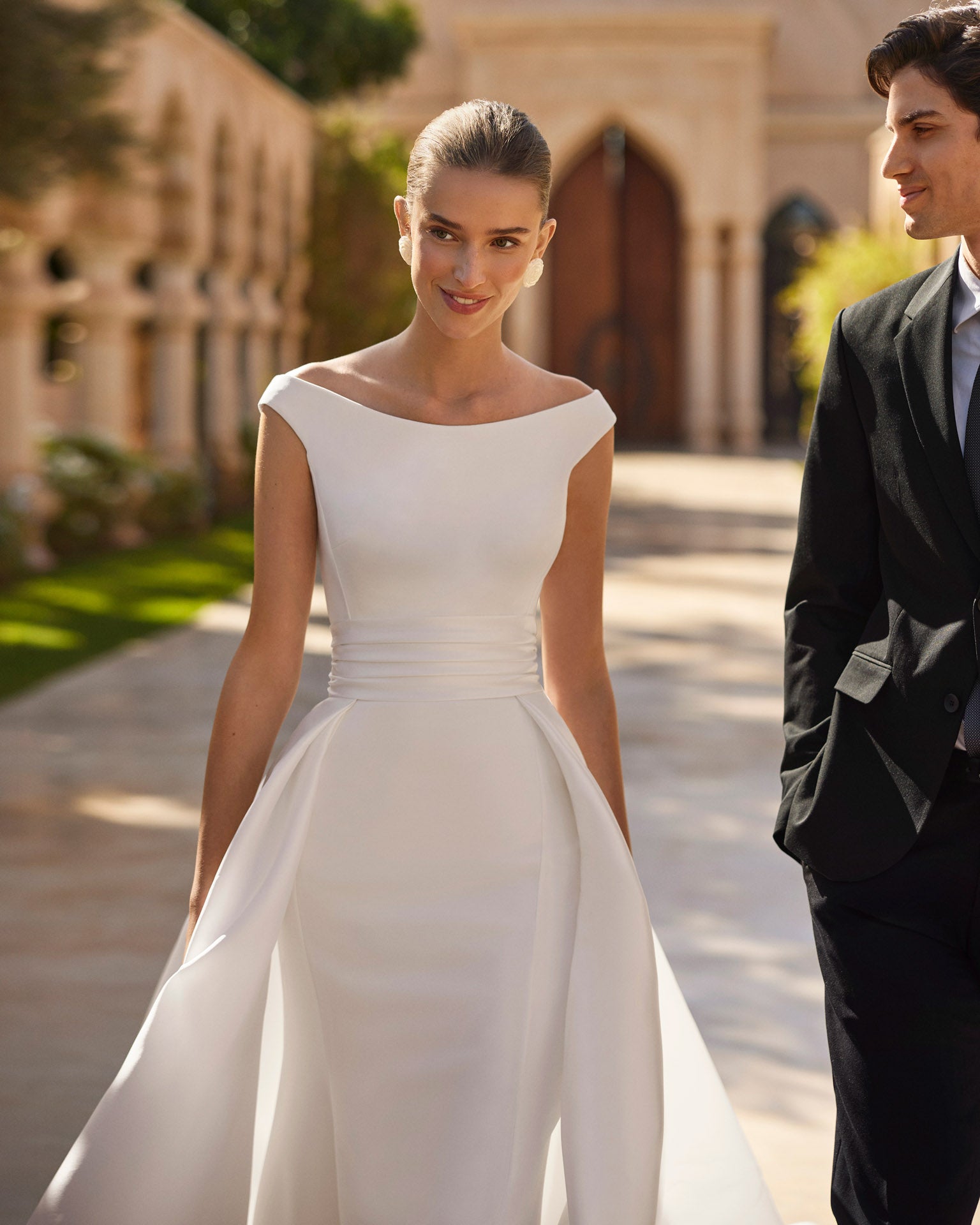 Long two-piece mermaid gown in bi-stretch crepe, featuring a bateau neckline, an airy overskirt, and a detachable mikado waistband.