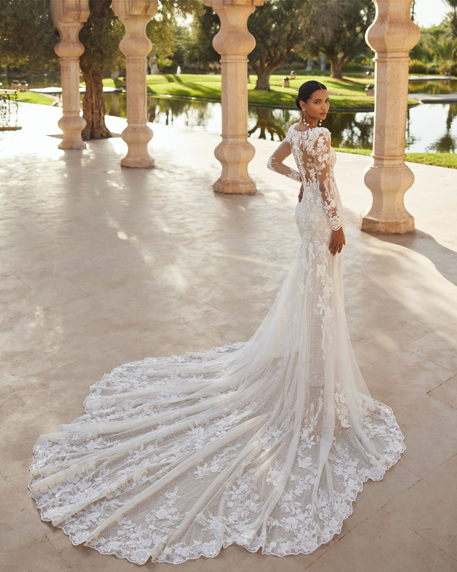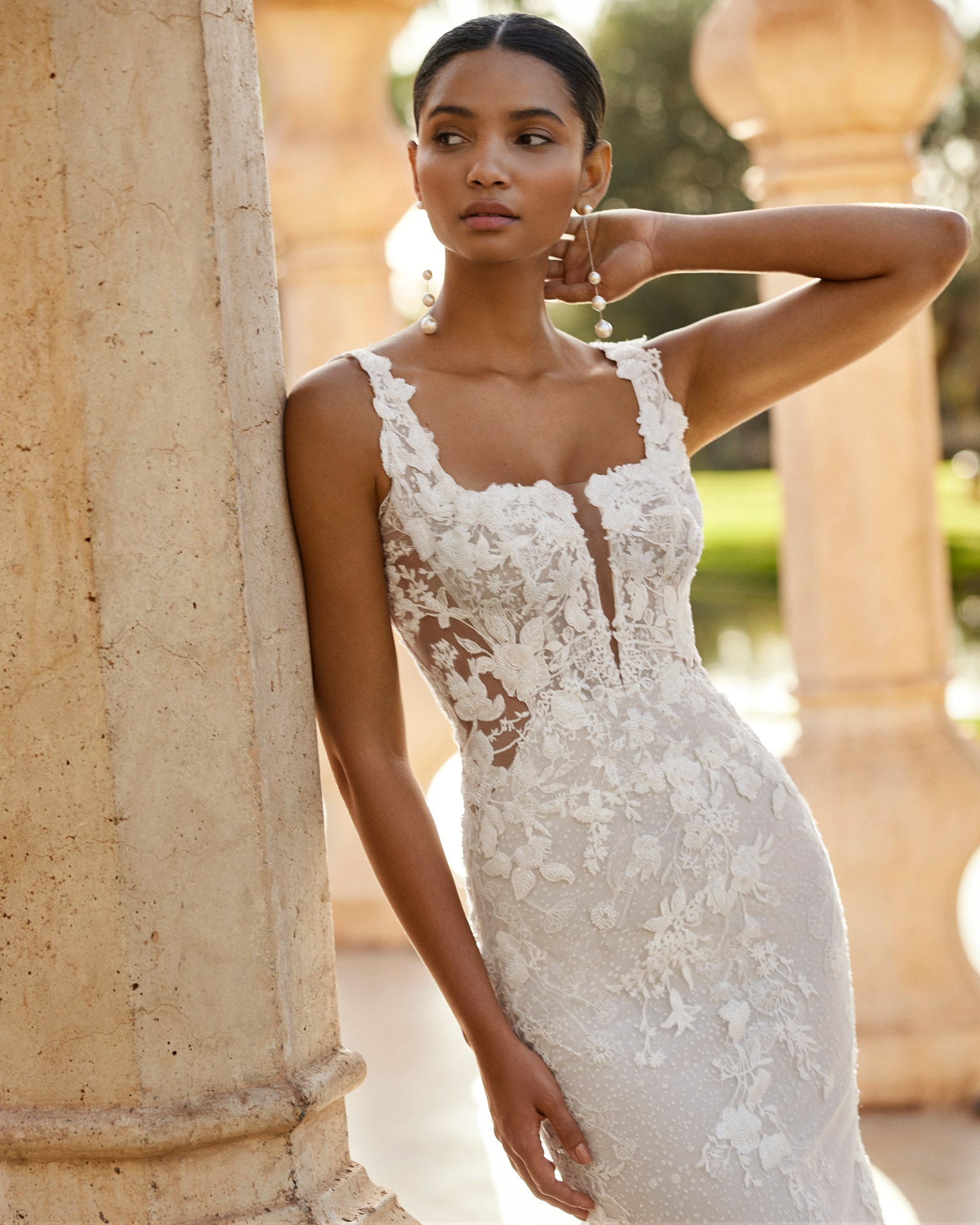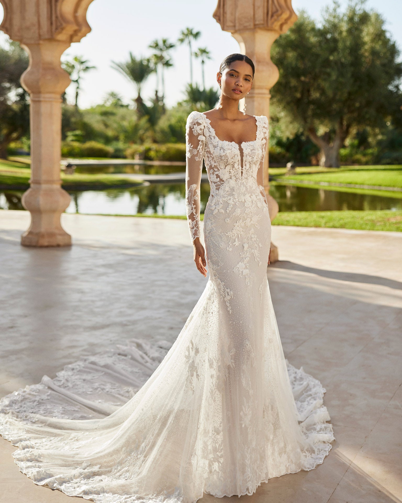 Long mermaid lace gown with beading, styled with a square neckline and refined detachable sleeves.