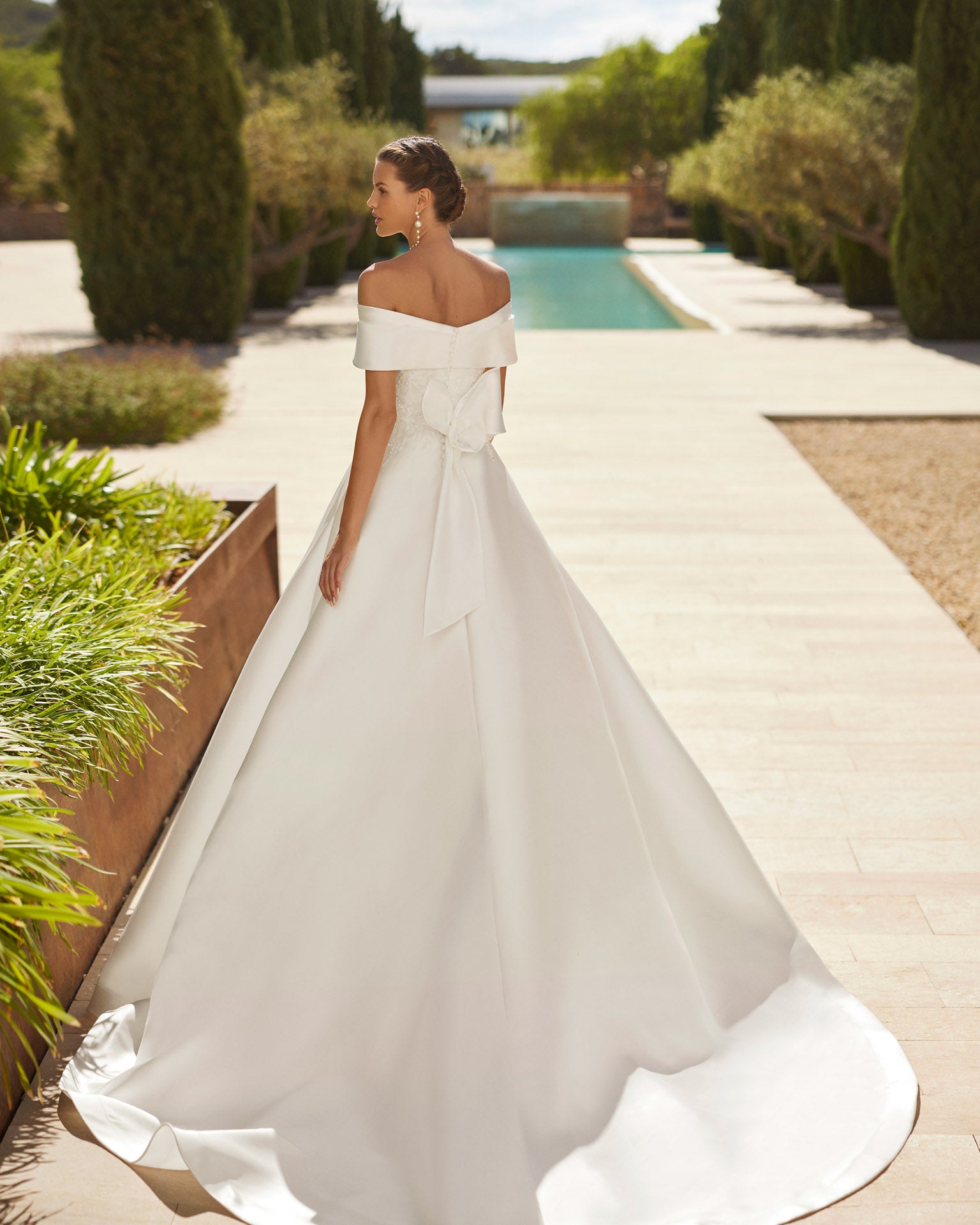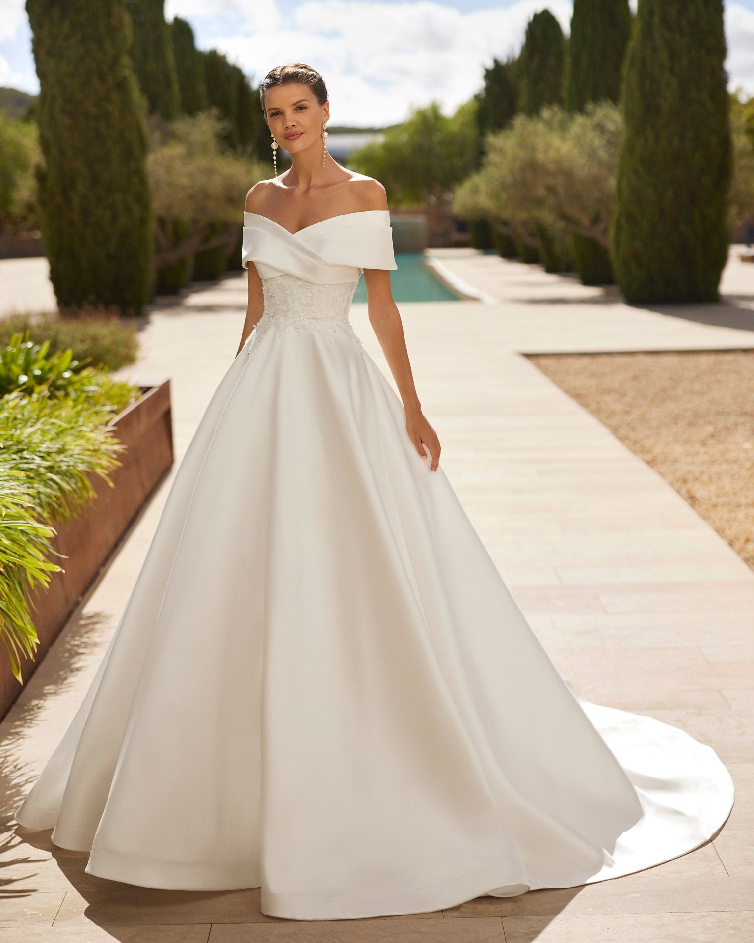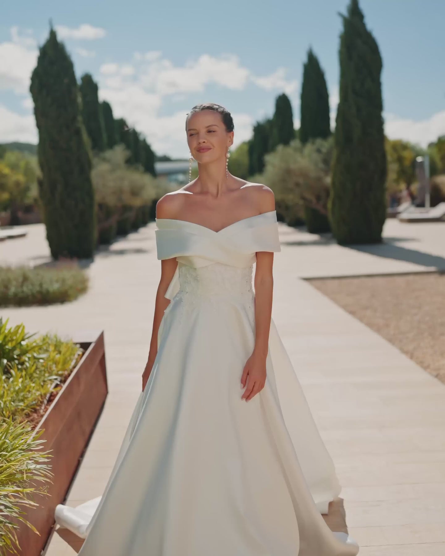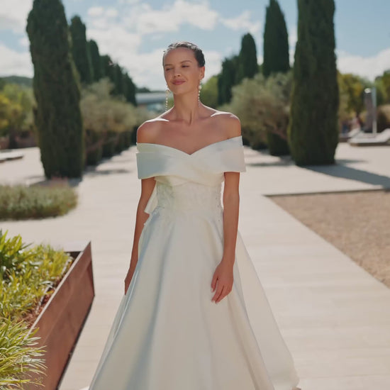 Long A-line mikado gown with a softly wrapped neckline and a skirt adorned with pockets for effortless charm.